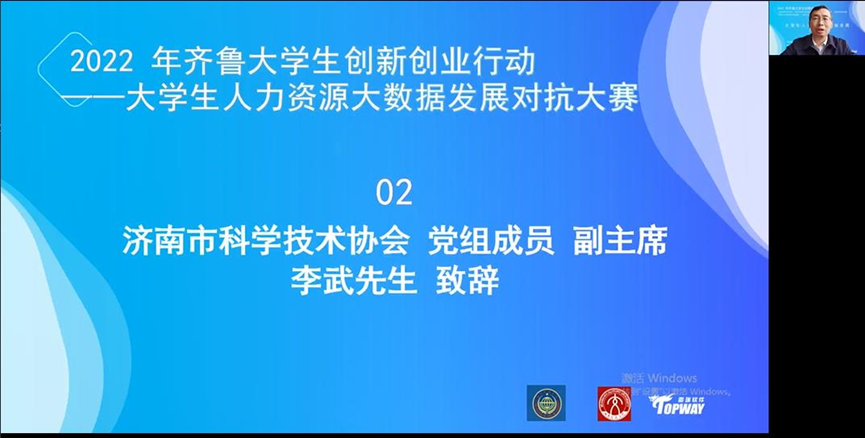 济南市科学技术协会党组成员、副主席李武先生首先致辞,他表示:“大学生人力资源大数据发展对抗大赛是齐鲁大学生创新创业行动的重要组成部分,举办大赛的目的是帮助学生掌握人力资源数据分析技能,提升创新创业就业竞争力,“以赛促教、以赛促学、以赛促训”,引导培养我省院校师生在新时代的新思维、新技能、新方法,也为各参与院校提供了很好的展示与交流的平台。”并且对青年大学生、大赛提出了更高的要求。